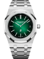 Smoked green dial with sunray pattern base. white gold applied hour-markers and Royal Oak hands with luminescent coating. 950 platinum bracelet with AP folding clasp.