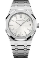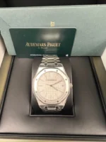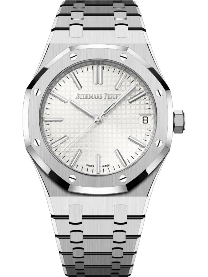 Silver-toned dial with “Grande Tapisserie�?pattern. white gold applied hour-markers and Royal Oak hands with luminescent coating.