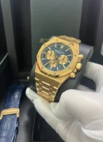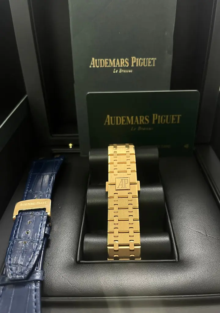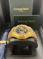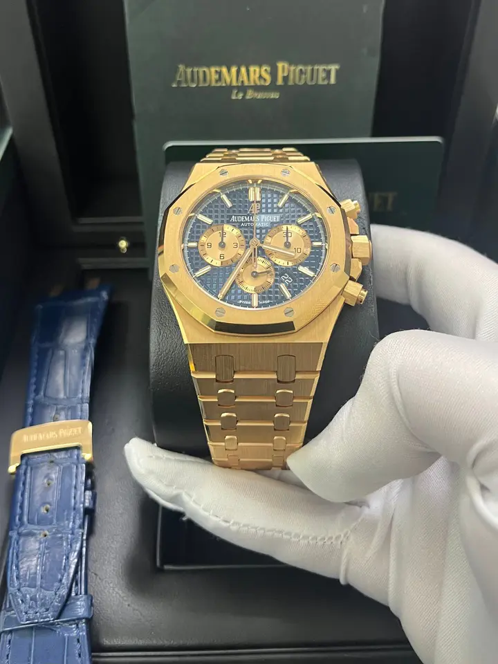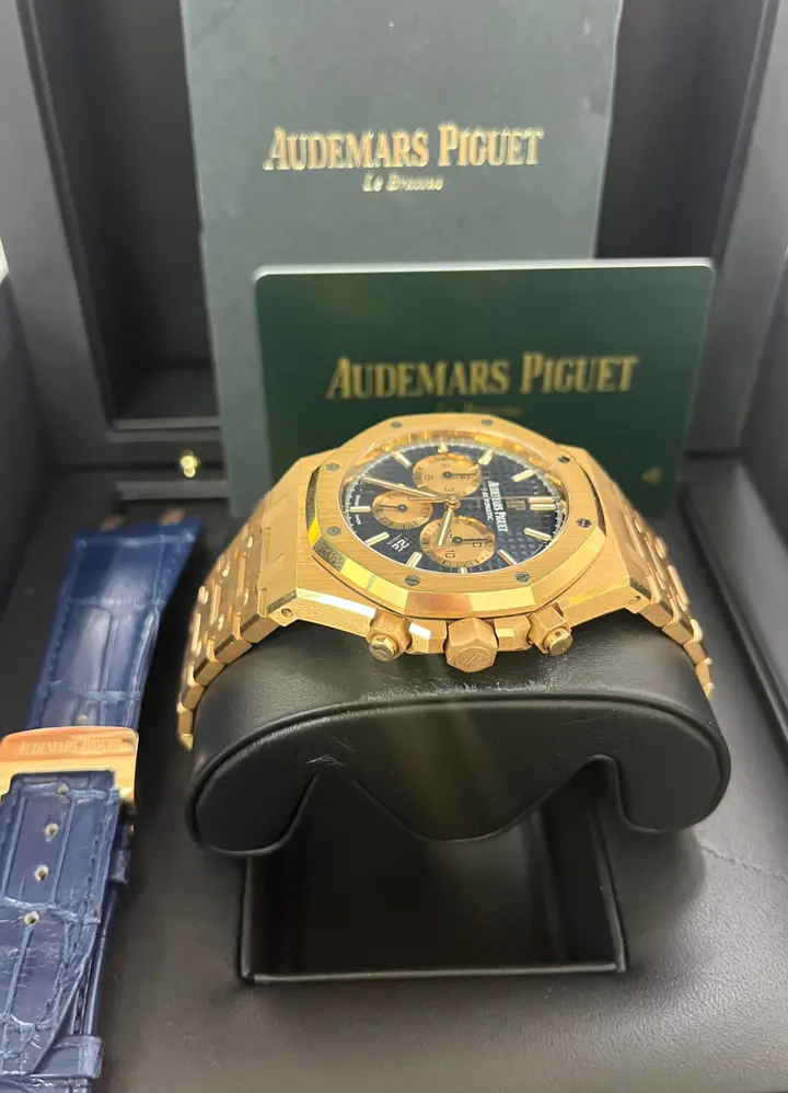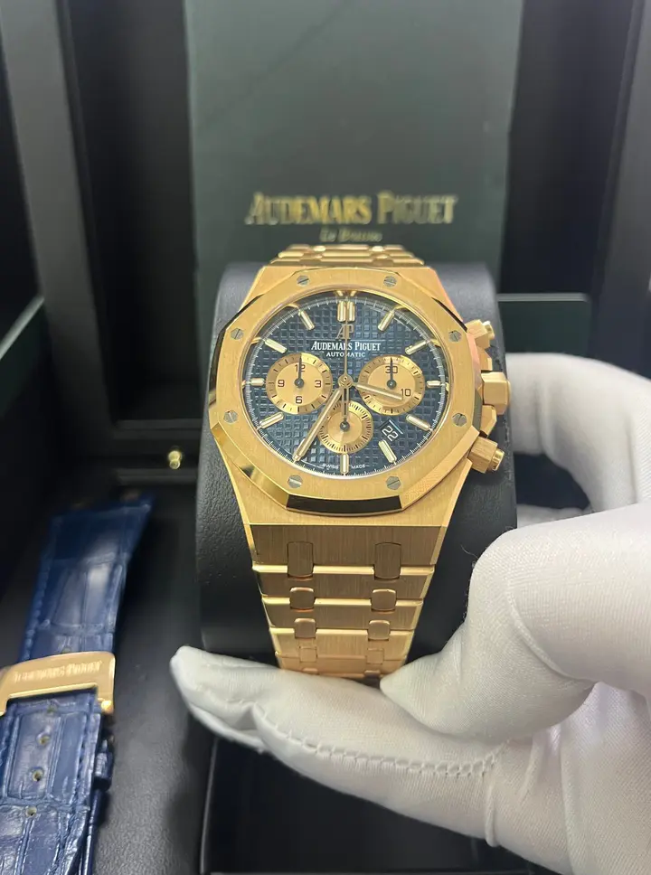 41mm 18K Pink Gold case. 11mm thick. screw-locked crown. glare-proof sapphire crystal. blue dial with Grande Tapisserie�?pattern. pink gold-toned counters. pink gold applied hour-markers and Royal Oak hands with luminescent coating. Calibre 2385 selfwinding movement with chronograph. hours. minutes. small seconds. date. approximately 40 hours of power reserve. 18K pink gold bracelet. AP folding buckle. Water-resistant up to 50 meters.