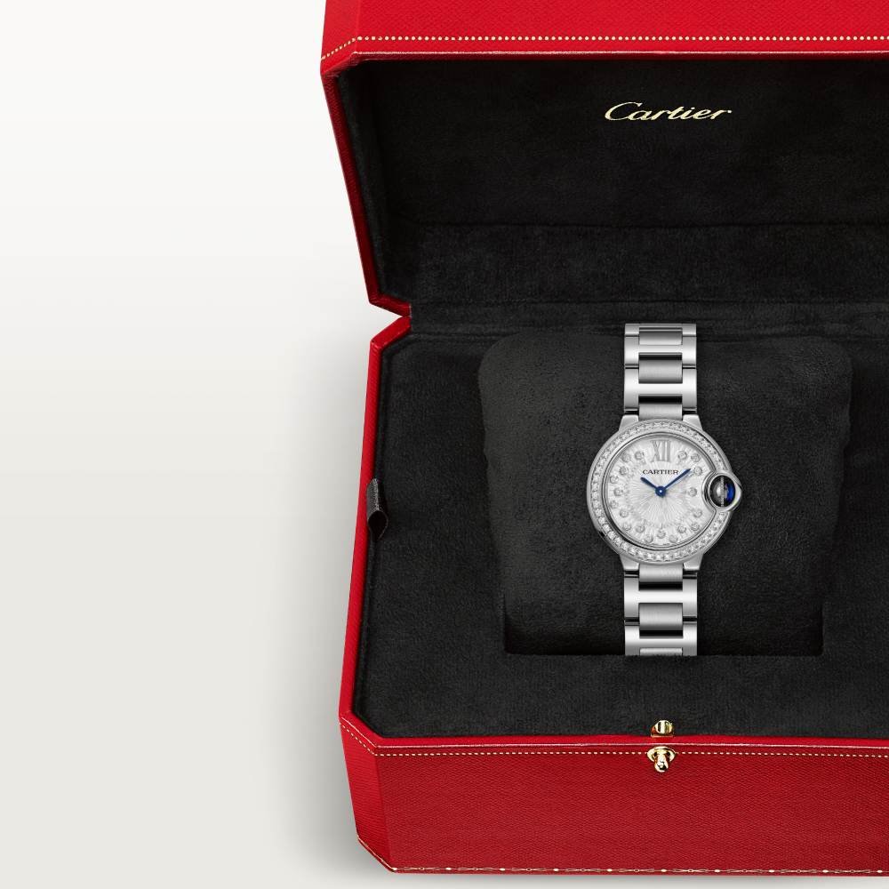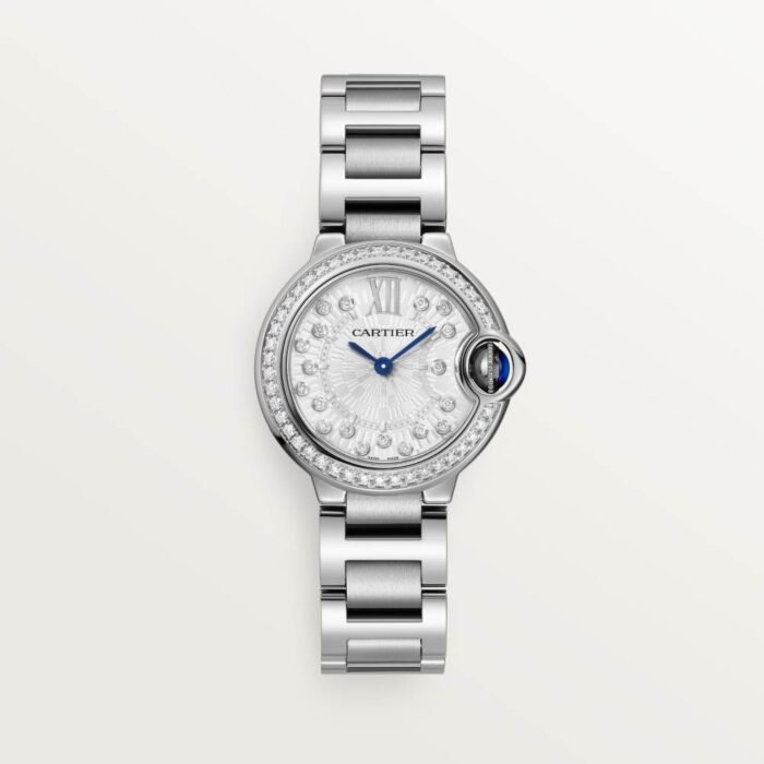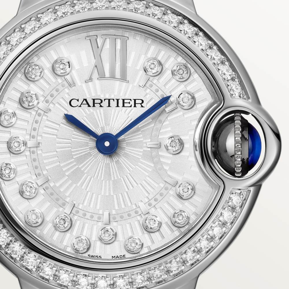 Ballon Bleu de Cartier watch, 28 mm model, quartz movement. Stainless steel case, stainless steel fluted crown set with 1 synthetic spinel cabochon. Steel bezel set with 42 brilliant-cut round diamonds. Silvered sunray dial set with 19 brilliant-cut round diamonds, sword-shaped blued steel hands. Synthetic sapphire crystal. Interchangeable steel bracelet. Thickness: 9.35 mm. Water-resistant to 3 bar (approx. 30 metres).