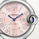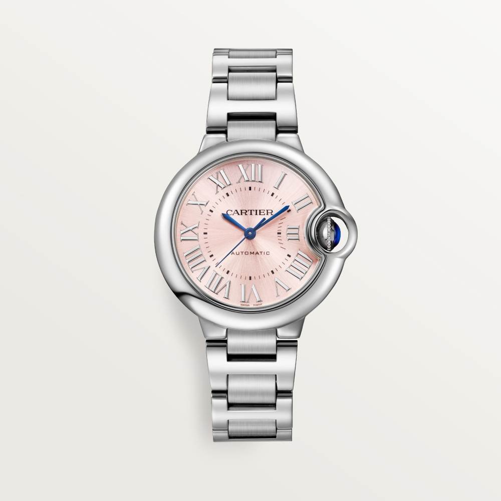 Ballon Bleu de Cartier watch, 33 mm, mechanical self-winding Cartier calibre 1853. Stainless steel case, stainless steel fluted crown set with 1 synthetic spinel cabochon. Pink sunray pattern dial. Sword-shaped blued steel hands. Synthetic sapphire crystal. Interchangeable steel bracelet. Case diameter: 33 mm, thickness: 10.16 mm. Water-resistant to 3 bar (approx. 30 metres/100 feet).