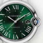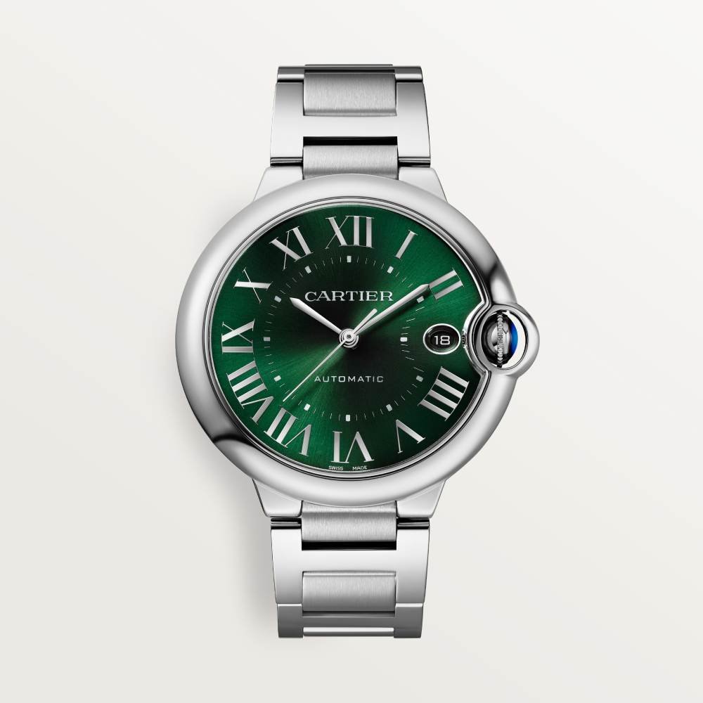 Ballon Bleu de Cartier, 40 mm model, mechanical self-winding Cartier calibre 1847 MC. Stainless steel case, fluted crown in stainless steel set with a synthetic spinel cabochon. Dark green dial with brushed sunburst pattern. Silver-plated sword-shaped hands. Synthetic sapphire crystal. Interchangeable steel straps. Date window at 3 o’clock. Thickness: 12.4 mm. Water-resistant to 3 bar (approx. 30 metres).