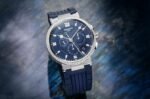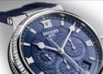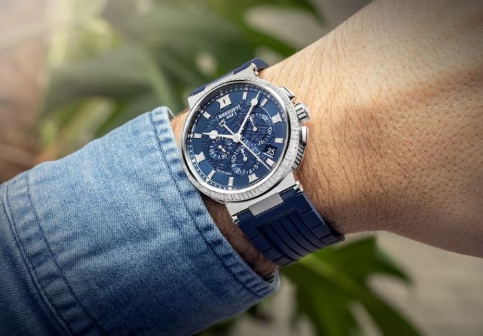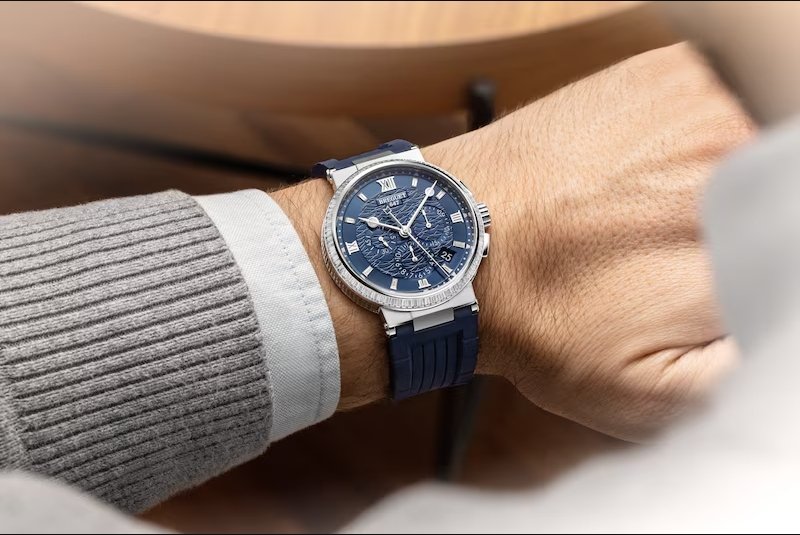 The chronograph functions are indicated by the largest hand, the end of which is shaped to echo the “B” flag, while the hours and minutes are indicated by two classic Breguet hands, and the 30-minute, 12-hour and 60-second counters are located at 3, 6 and 9 o’clock, respectively, to complete the watch’s time display. The date window is located between 4 and 5 o’clock. The dial and bezel are set with nearly one hundred baguette-cut diamonds, adding sparkle to this 42.3 mm diameter timepiece.