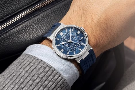 Set with baguette-cut diamonds, the indications of this Marine Chronographe have been carefully designed and elegantly arranged on the dial.