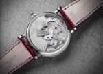 The small mother-of-pearl dial reveals the mainspring barrel decorated with a rose motif. The oscillating weight beneath the sapphire glass caseback is decorated with the same motif. The bezel and clasp of this model are set with brilliant-cut diamonds, and the crown is set with a jewel.