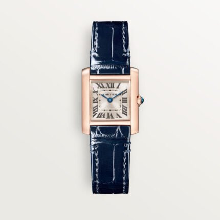 Tank Française watch, small model, quartz movement. Set with 1 sapphire cabochon. Gilded sunburst bezel, sword-shaped blued steel hands, synthetic