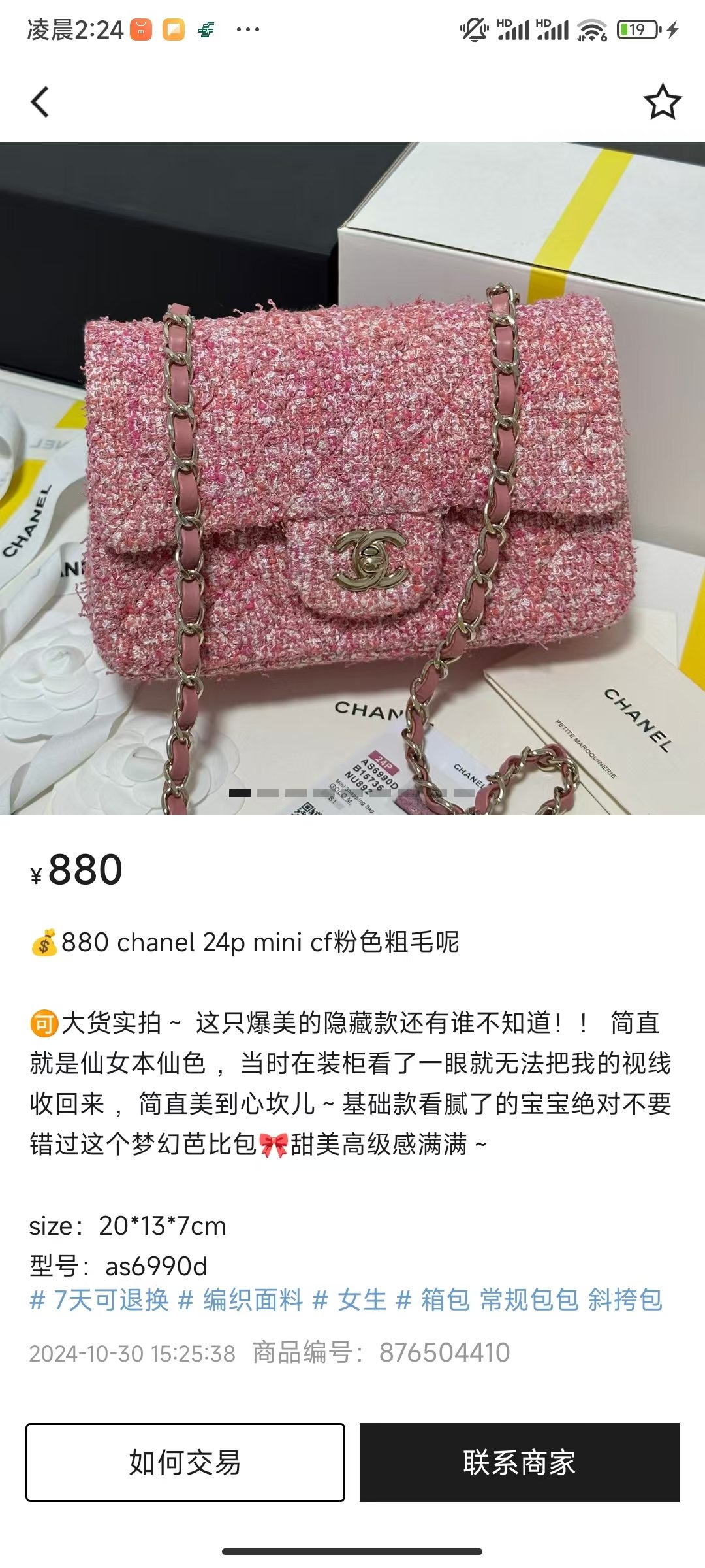 Chanel 24P mini CF Pink Tumbled Leather Tote Bag, size:20*13*7cm Model:as6990d