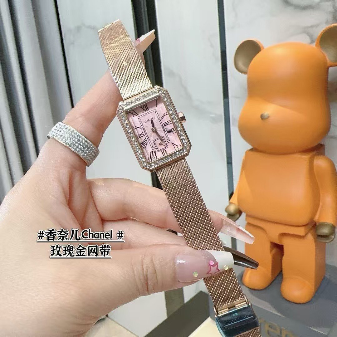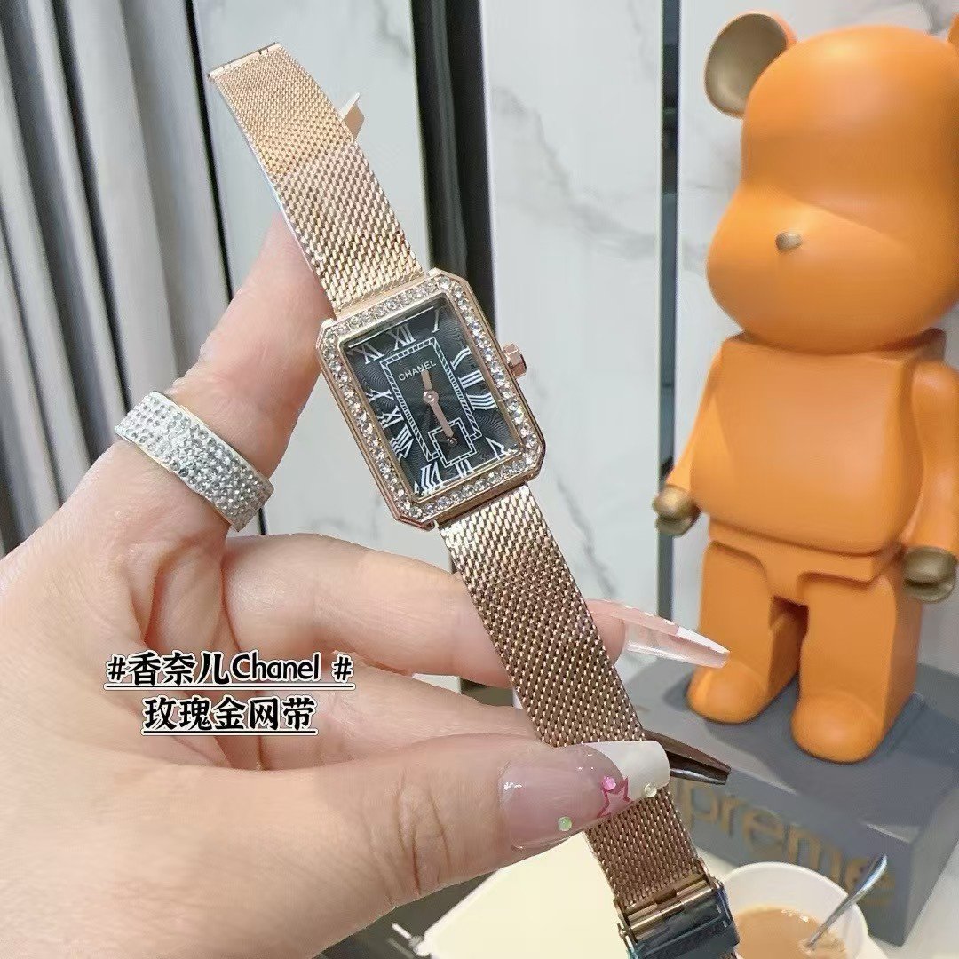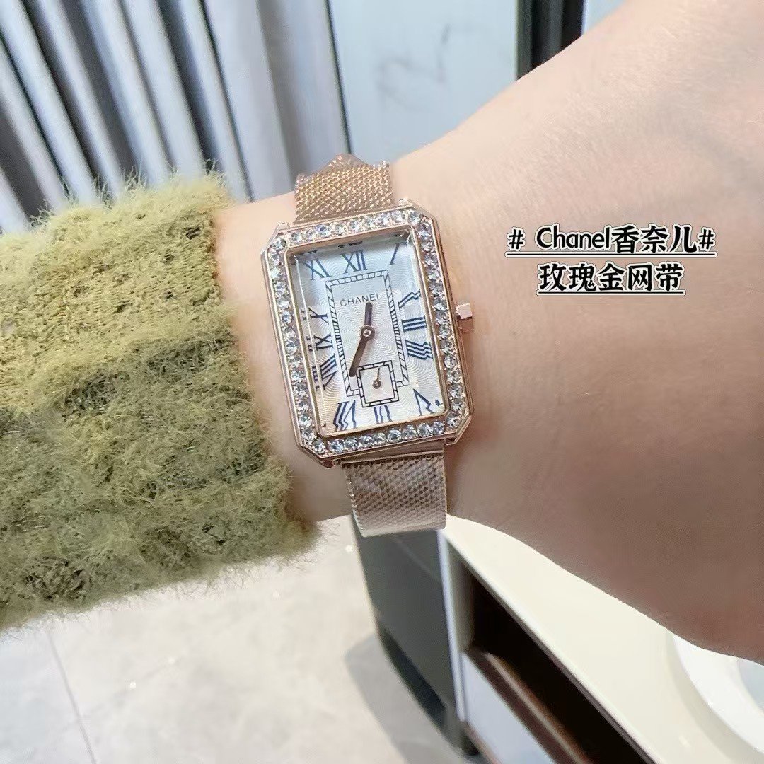 chanel with a straight serigraphic leather strap and a slightly square case that contrasts with the elegance of the minimalist