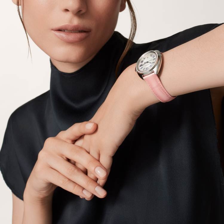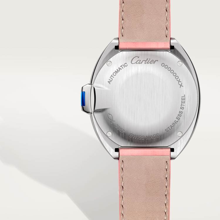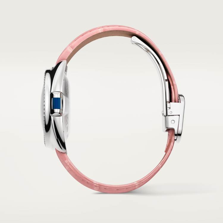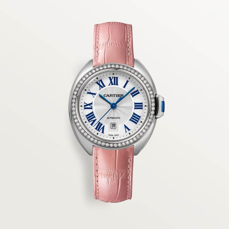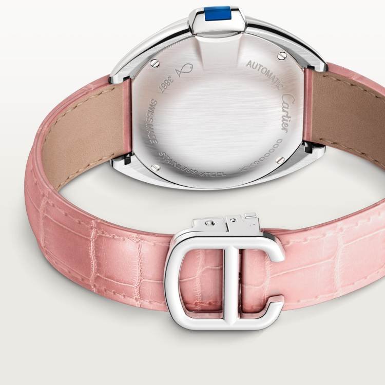 Clé de Cartier Key watch, 31 mm model, self-winding mechanical movement. Steel case, key-shaped crown set with a synthetic spinel. Steel bezel set with 61 brilliant-cut round diamonds totaling 0.39 carats. Engraved silver-plated dial with sunray pattern effect, sword-shaped blued steel hands, sapphire crystal, pink alligator strap, steel folding clasp. Case thickness: 11 mm. Water-resistant to 3 bar (approx. 30 meters).