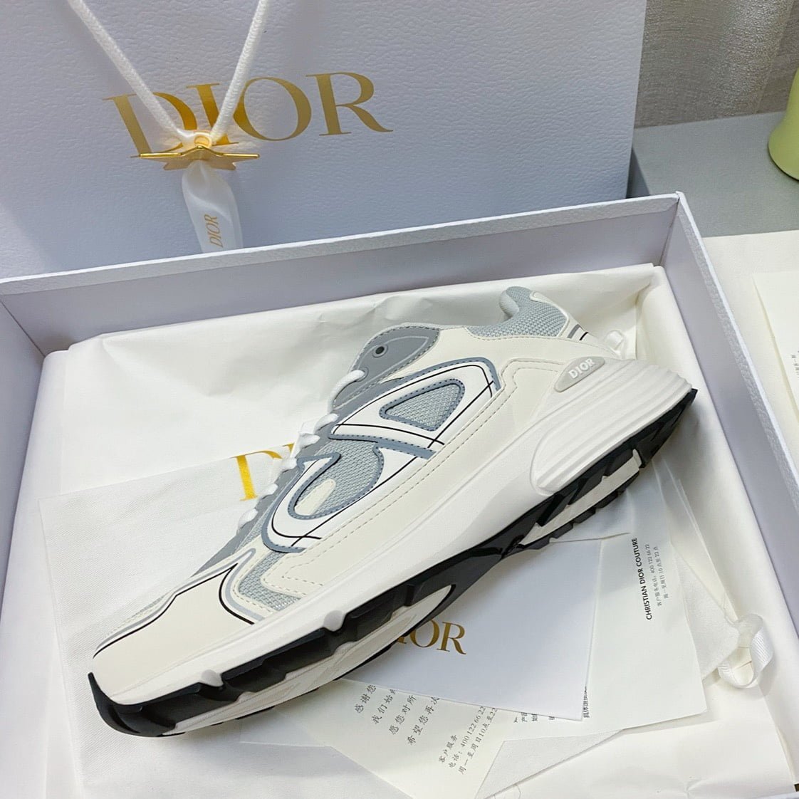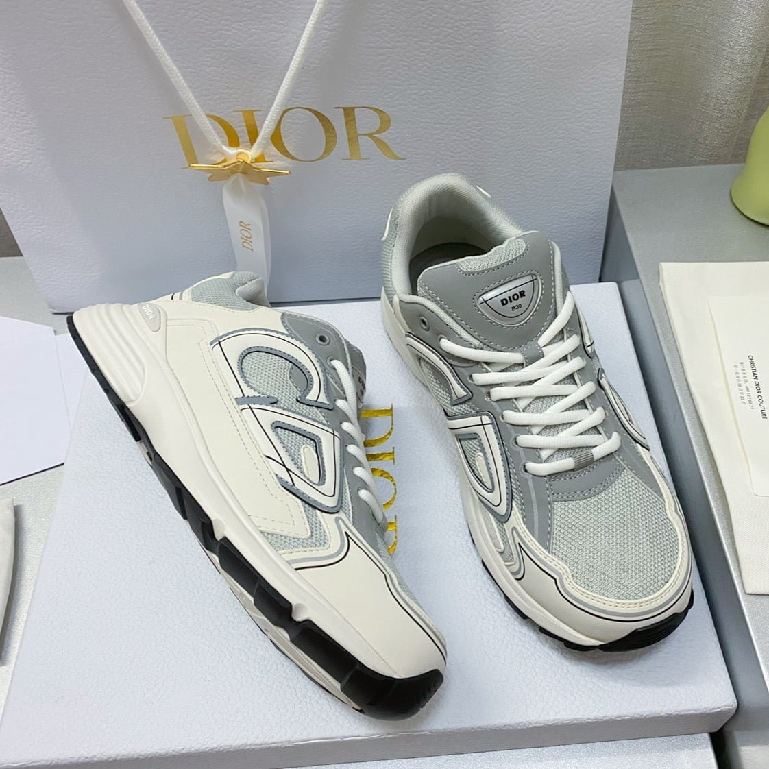 The new B30 sneakers conform to the trend of the retro market Dad Shoes style shoes The Dior logo on the tongue also indicates that the shoes are B30 model! B30 uses fine texture leather and mesh fabric material to splicate into the shoe body. the shoe body on both sides of the prominent letter CD to indicate identity. the shoe body many lines outline details make the shoe look not so monotonous. vintage flavor