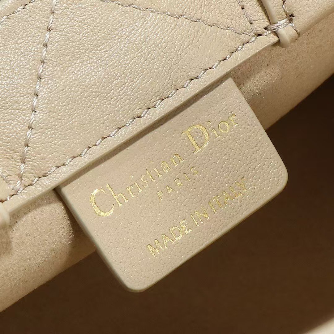 DIOR / MINI LADY DIOR BAG Latte Crinkle-Effect Lambskin with White Resin Half-Pearl Cannage Motif M0505OWFX_M941