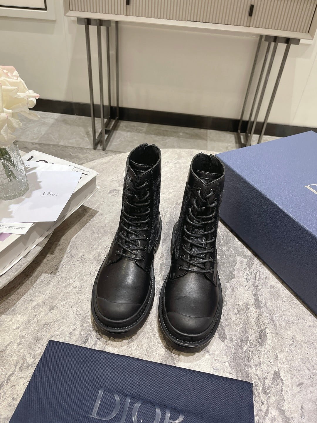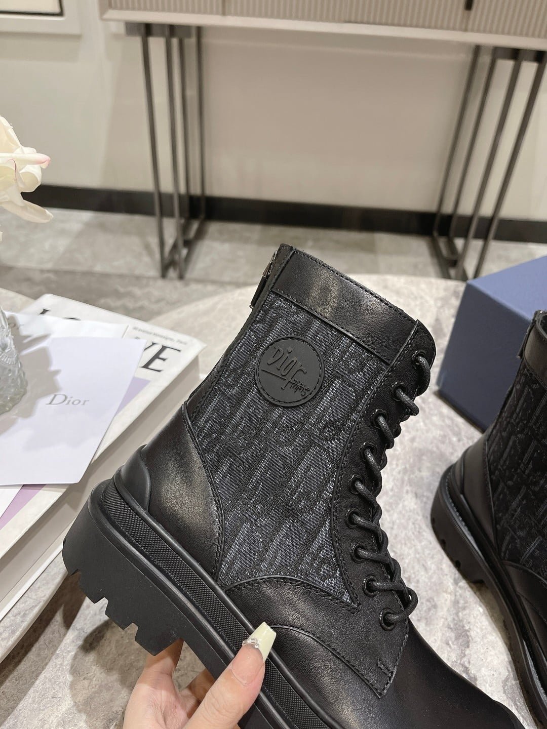 The Dior Ex lorer ankle-length boots are crafted in black smooth cow leather with a beige and black Oblique print stitching on both sides. With sheep leather full lining material. create a comfortable wearing experience. The rear zipper opens and closes for easy wearing and removing. Decorated with DIOR logo patches. with notched rubber soles and reinforced rubber toe in the same color. more sophisticated. It can be paired with various pieces of the season for a stylish look. With the exquisite packaging of the counter 🛍📦