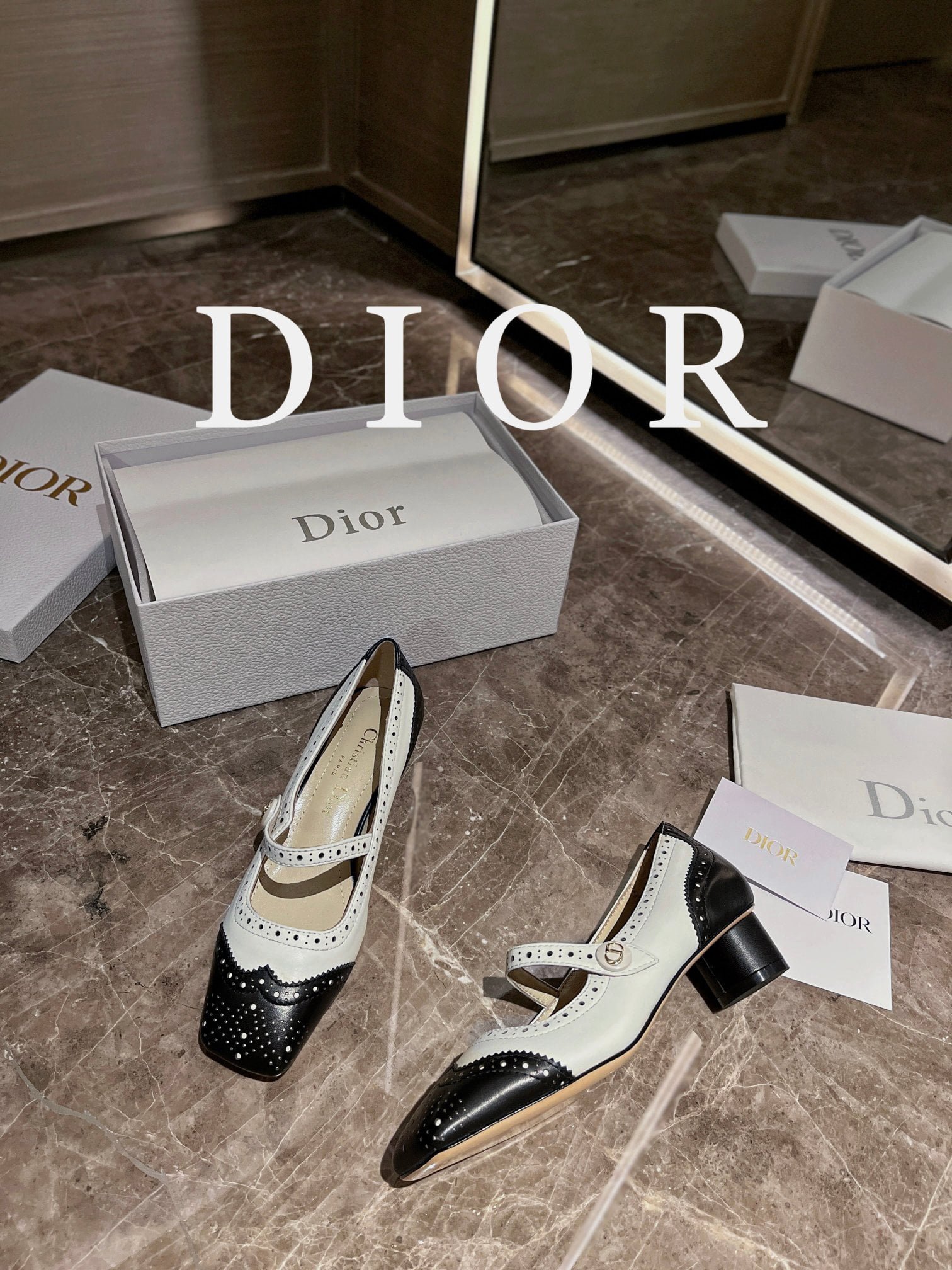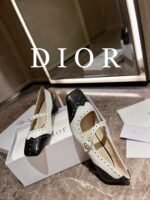 These Spectadior ballet heels were presented at the launch show. reinterpreting the classic Mary Jane shoes and highlighting the elegant and stylish style. Two-toned black and white ox-leather uppers with decorative perforated details. paired with a sash adorned with a gold-finished CD logo. The elegant square toe and 3.5cm cylindrical heel are refined and can be paired with the gaiters of the collection for equestrian elegance.