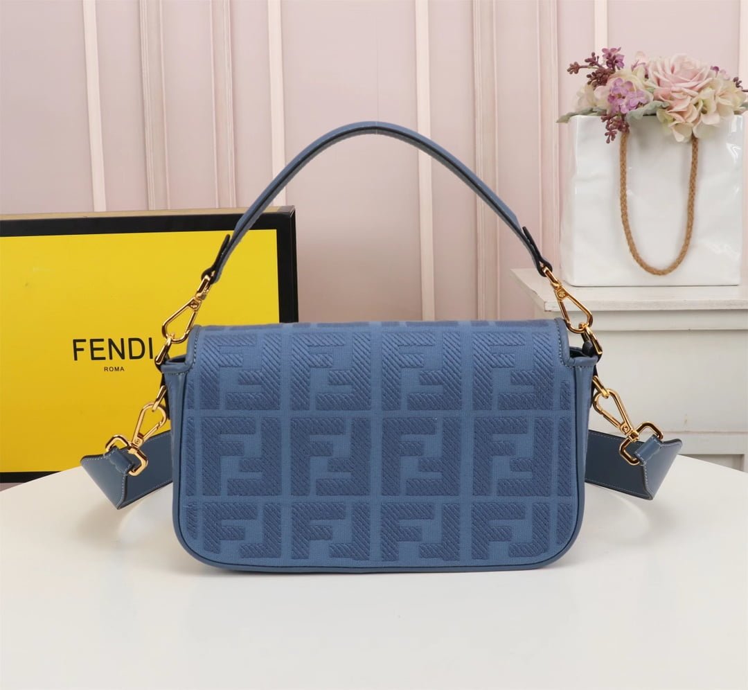 2023 Fendi’s latest baguette bag: very summery;  F embroidery colors. This Fendi Baguette is sure to be a trendy item this summer! It looks great on the top; Attendance is also particularly high; It’s absolutely fine for a concave shape. Very lightweight. And its capacity is also very powerful; Easily meet your daily needs. With a short strap and a wide shoulder strap; Can be carried on one shoulder and crossbody. Very versatile. It’s easy to wear no matter what style you have. Carry it and you’ll be the brightest goddess in the crowd. Model F2029 Size 26-5-15CM