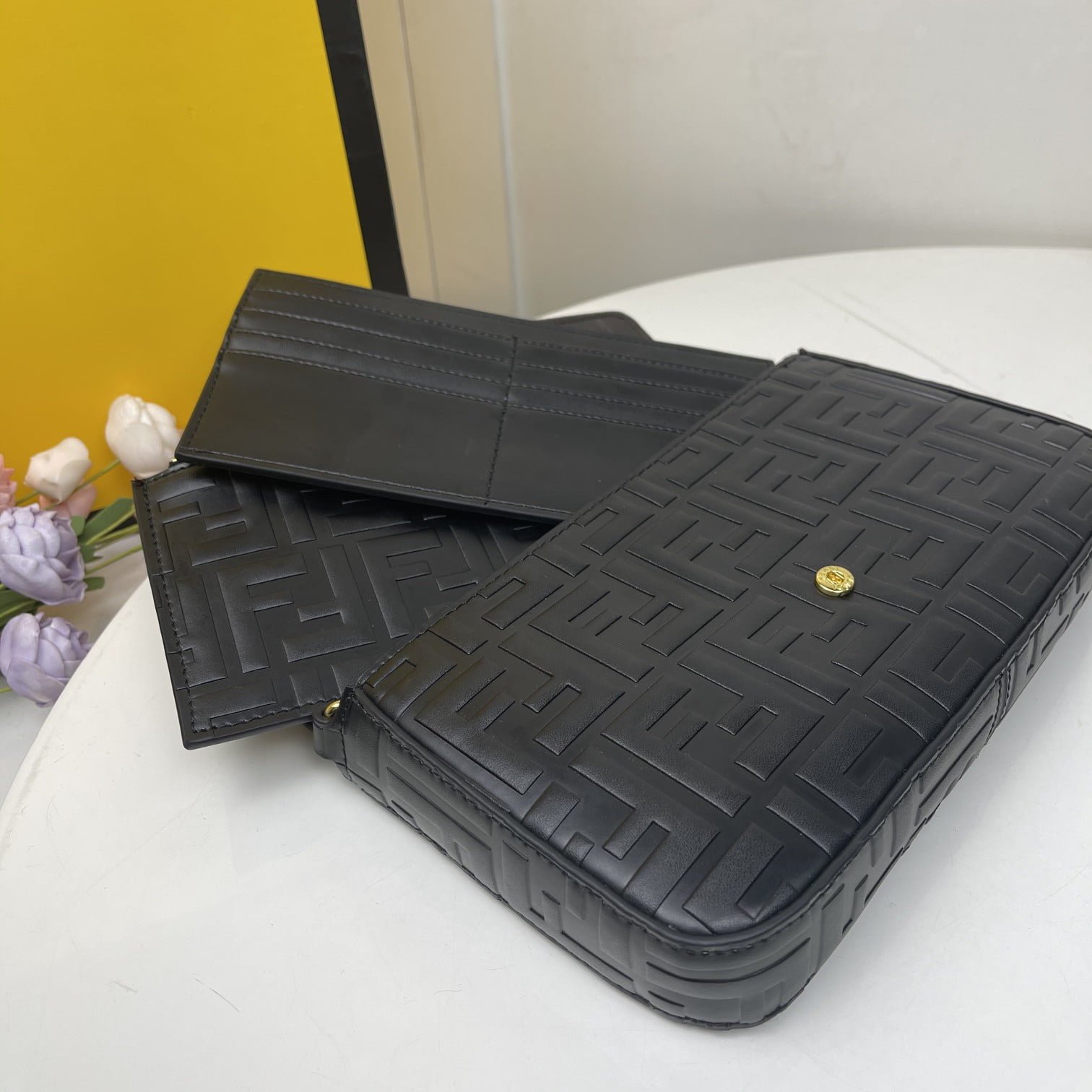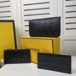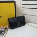 【FENDI】 Fendi’s latest geometric clamshell mini handbag with hardware accessories including the Fendi logo. Adopts the button opening and closing type, with two detachable inner bags – one with zipper, one with 8 card slots. Detachable chain strap. Lining with flat pockets. Black hand relief FF print. Gold metal pieces;