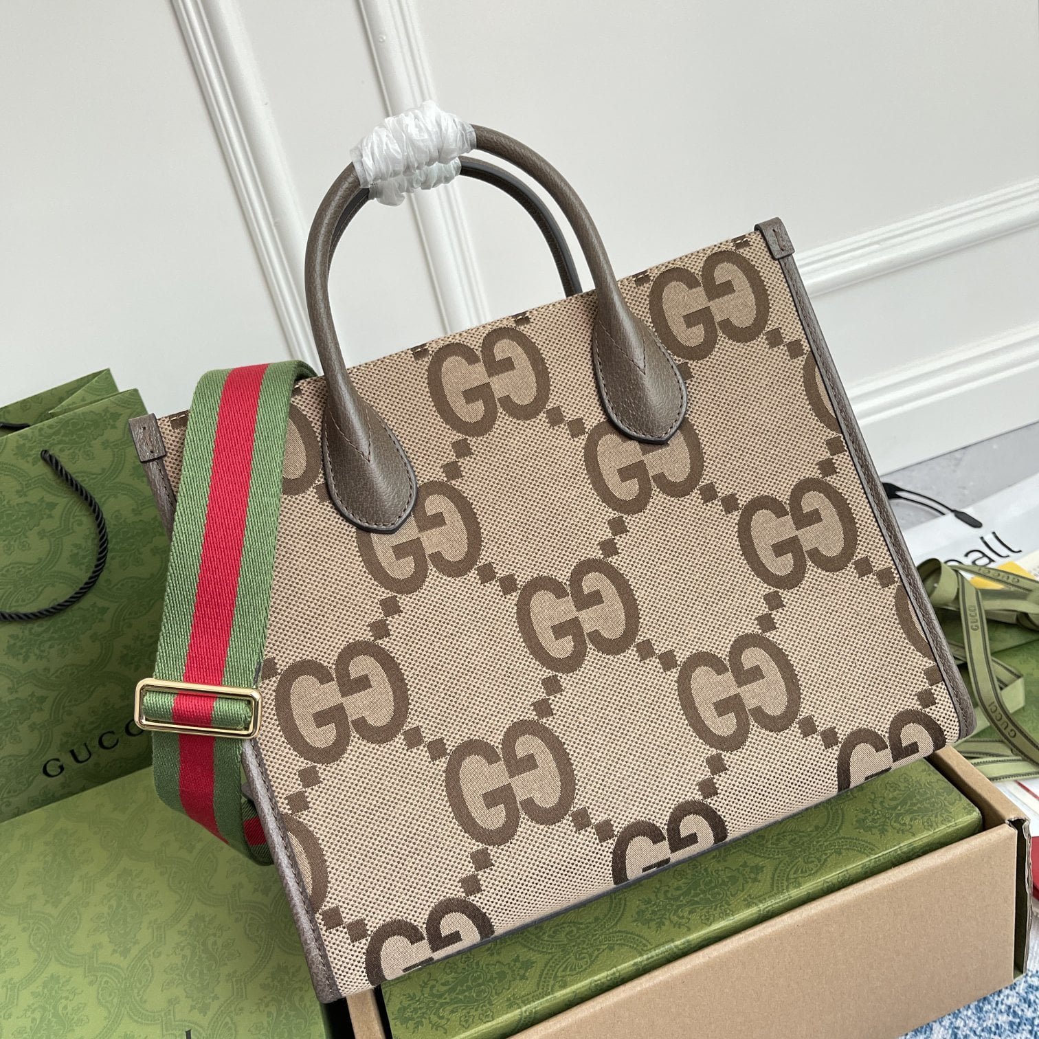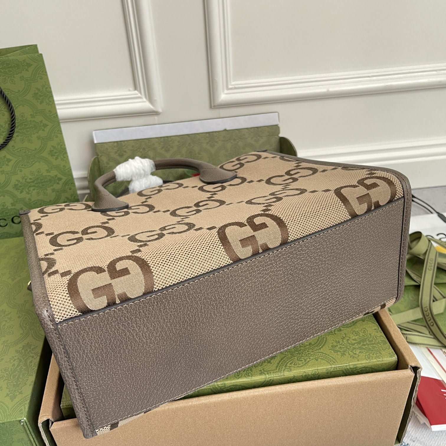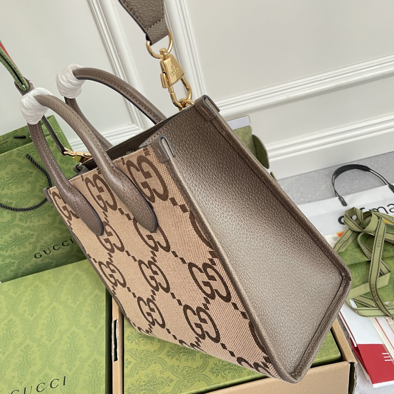 The petite gg mini handbags are packaged in the original green box. The iconic double g element is presented in