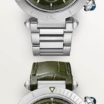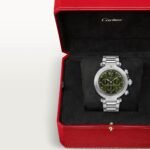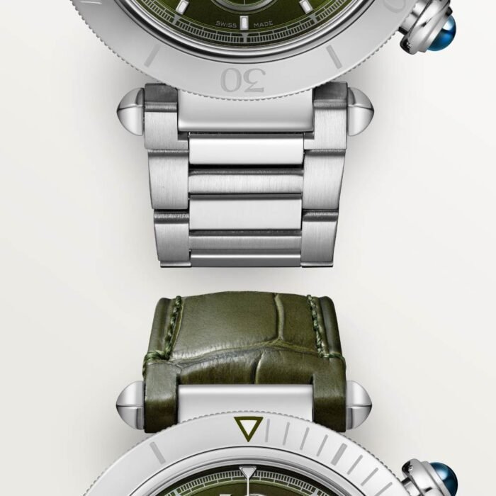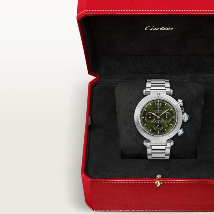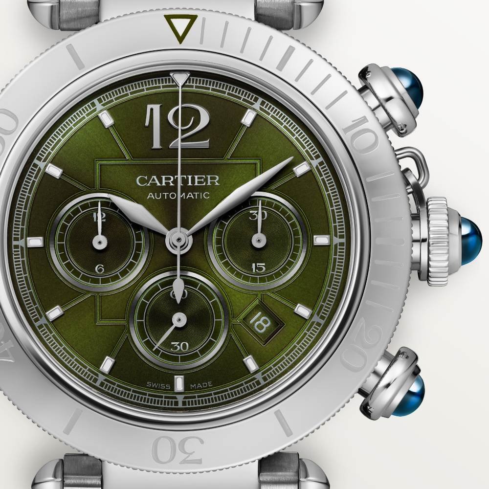 Pasha de Cartier watch, 41 mm model, mechanical self-winding chronograph movement Cartier calibre 1904-CH3 MC workshop. Stainless steel case, screw-down crown cap, crown and pushpieces set with synthetic spinels, olive-green sunray dial, diamond-shaped stainless steel hands, stainless steel bracelet with ‘SmartLink’ metal bracelet adjustment system, supplied with a green crocodile leather strap with interchangeable stainless steel folding clasp. Both strap and bracelet are equipped with the ‘QuickSwitch’ strap quick-change system. Case diameter: 41 mm, thickness: 12 mm. Water-resistant to 10 bar (approx. 100 metres).
