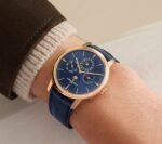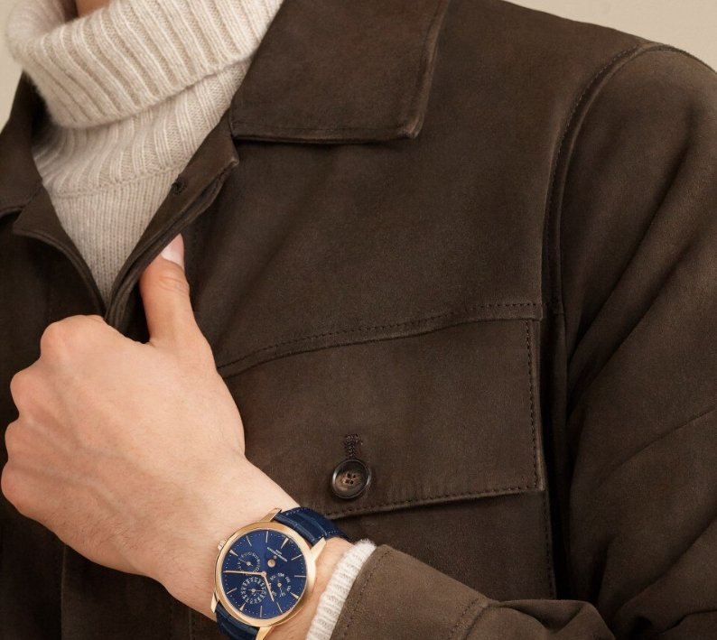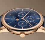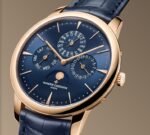This 18-carat pink gold watch houses an ultra-thin self-winding movement measuring only 4.05 mm thick and featuring an elegantly designed perpetual calendar that will run until 2100. The 18-carat gold moon phases are highlighted by a blue dial with a sky background made of in-filled enamel and decorated with two hand-decorated moons.