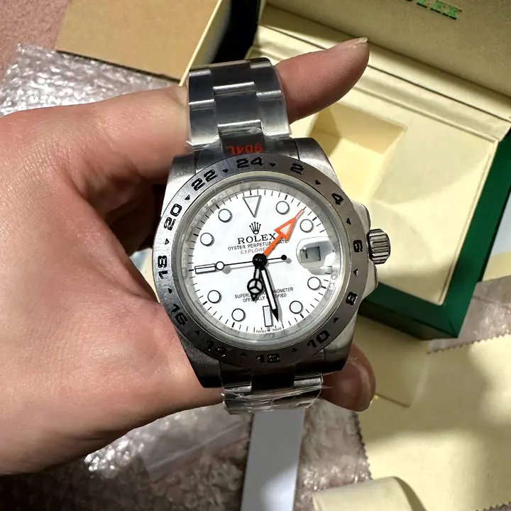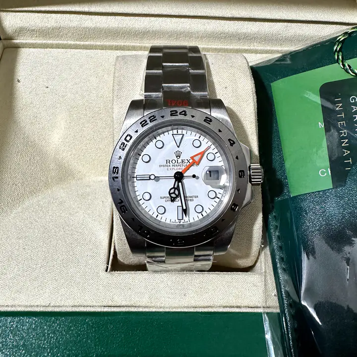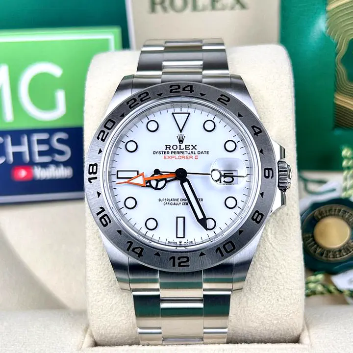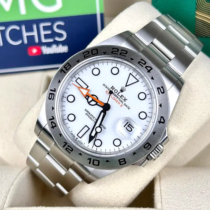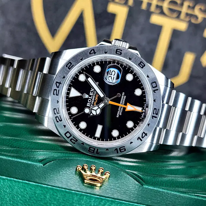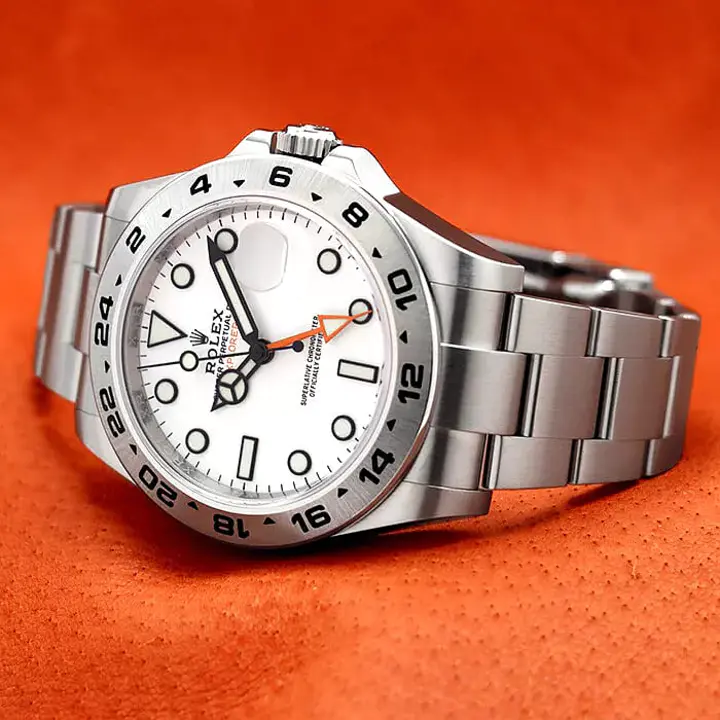 The Explorer II is equipped with an additional 24-hour display; a dedicated hand circles the dial in 24 hours rather than the usual 12, pointing to a fixed bezel with 24 hour graduations.