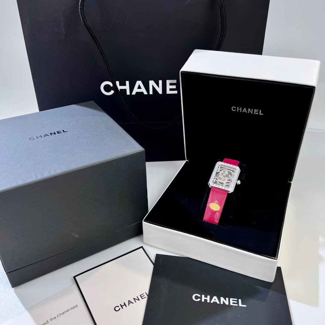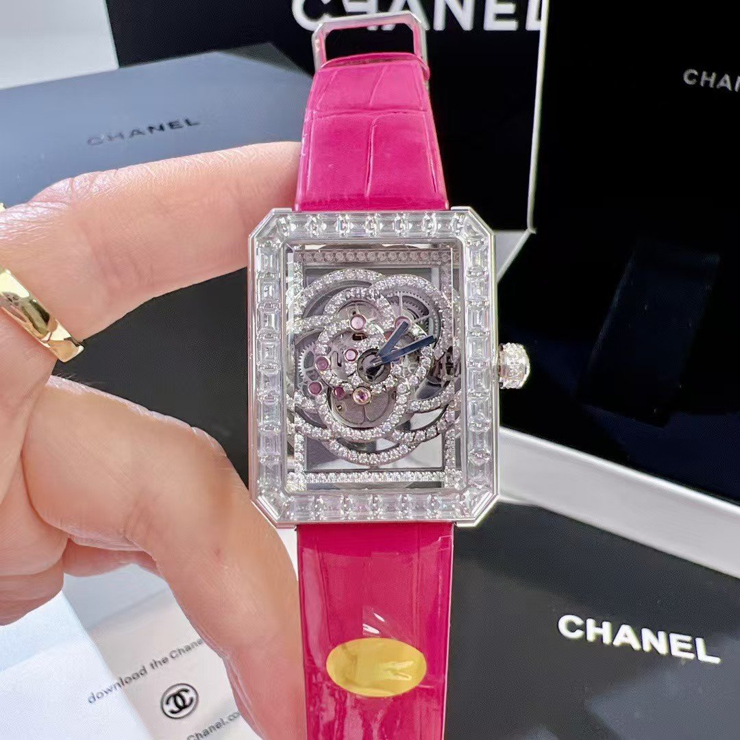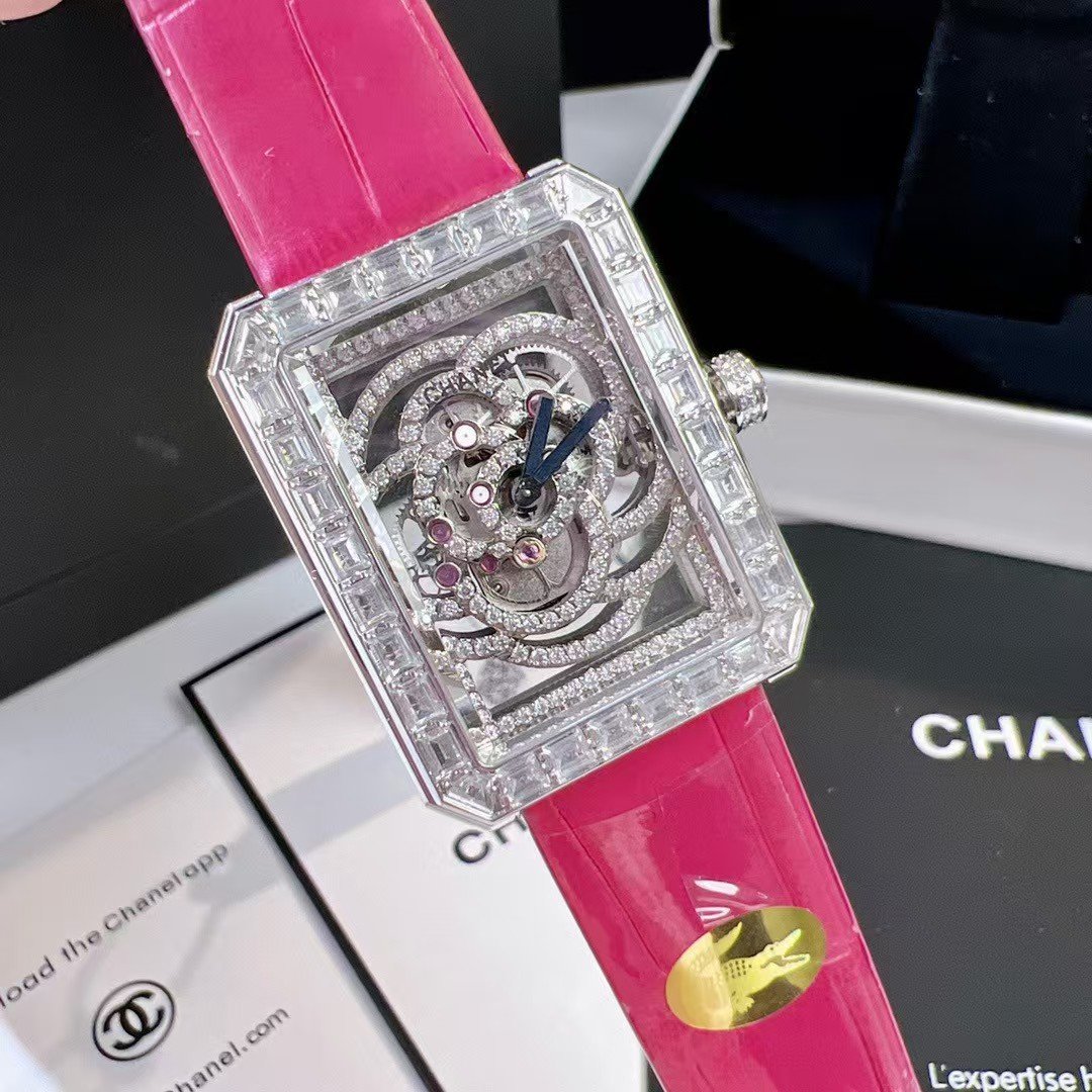 chanel première camélia skeleton series of watches, fully integrated into the design elements, angular, minimalist design, simple and powerful lines without unnecessary modifications, but without losing the atmosphere more fearless female unisex beauty carved their own. Flexibility and rigidity is the label of the new era of women, they need to balance work and life, but also to maintain a taste for women should keep the posture. Even as the years go by, they are still beautiful. Whether in fashion or jewelry, the camellia is everywhere in Chanel’s world. Like this geometric flower, its purity is unparalleled, symbolizing passion and romanticism, and refreshing her thoughts of true love. Strap between steel ceramic, using zirconia ceramic, is ceramic in the strength and toughness, comprehensive best material, known as ‘ceramic steel’. size 26*34*9mm.
