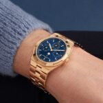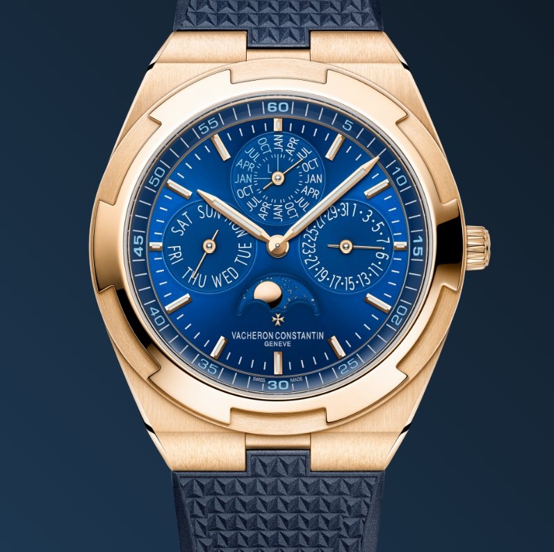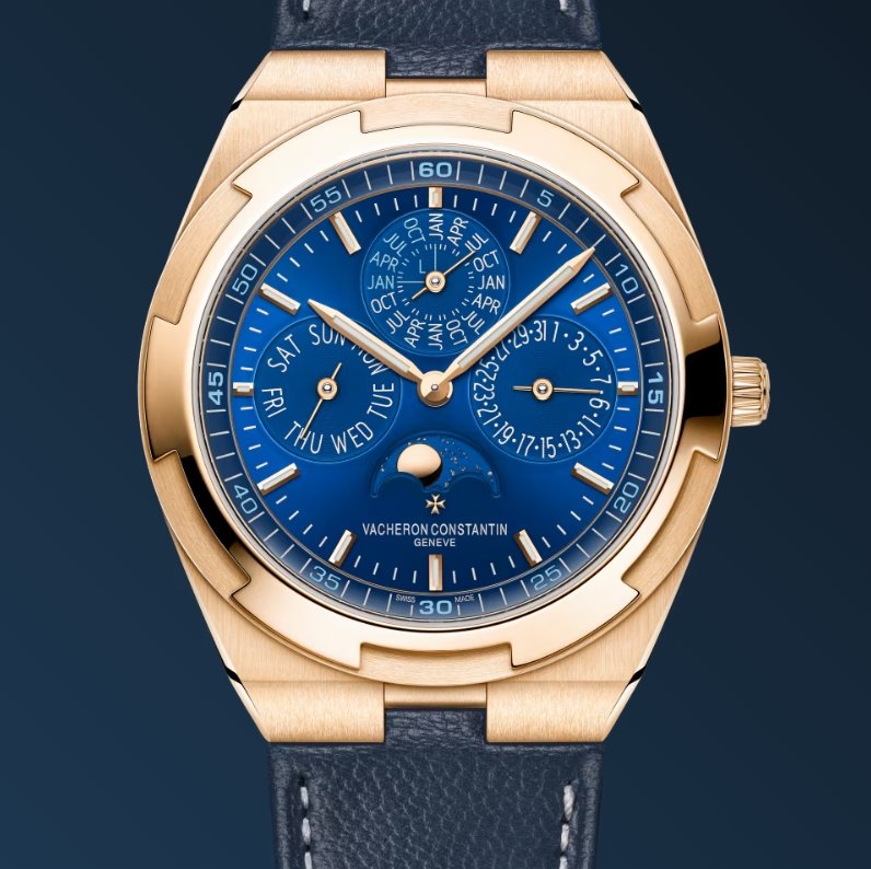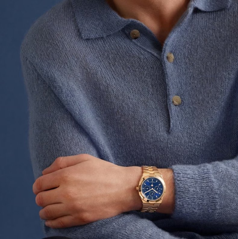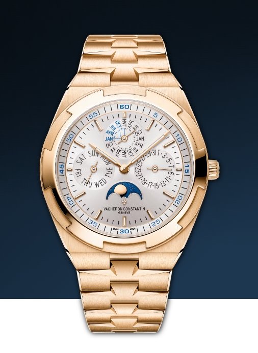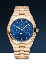 This 18K 5N pink gold watch combines haute horlogerie with sporty aesthetics and exudes elegance. Measuring only 8.10 mm thick, it features an ultra-thin perpetual calendar that will run until 2100. The perpetual calendar is complemented by a precision moon phase featuring two gold moons and a sky background that harmonizes with the blue tones of the dial. The watch is fitted with an interchangeable bracelet system offering three straps (leather, rubber and 18K 5N pink gold) that can be personalized to the wearer’s preference. The links of the bracelet subtly display the Maltese Cross, a classic Vacheron Constantin element.
