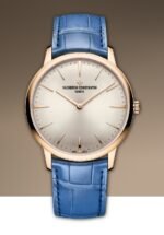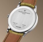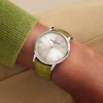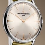 This 18K white gold timepiece is a classic of pure style and watchmaking savoir-faire. The hour-markers and hands, inspired by 1950s design, complement the subtle lines of the dial. The new olive green strap adds a fresh touch of contemporary aesthetics to this timepiece. The ultra-thin case is only 7.7 mm thick and features a sturdy caseback that can be personalized and engraved to the owner’s liking.