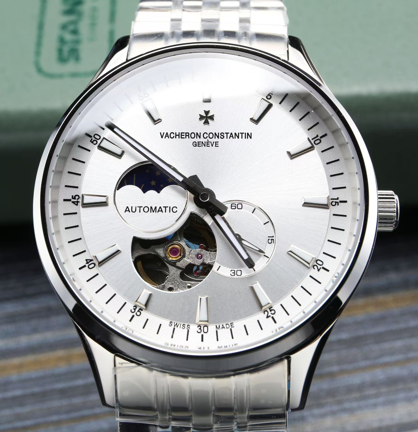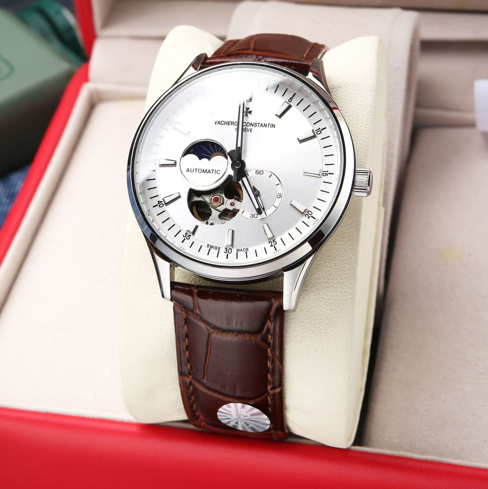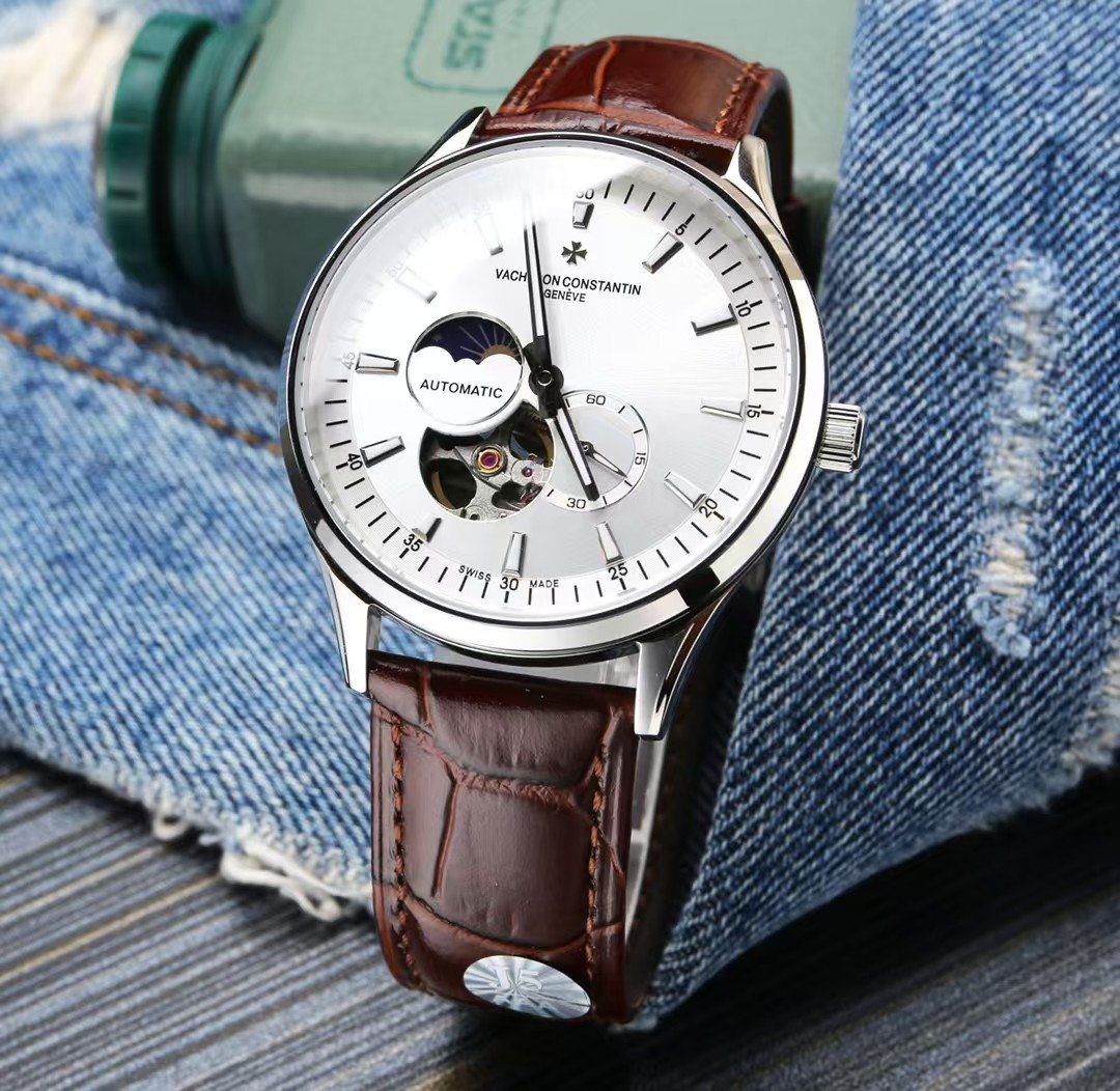 Vacheron Constantin, Sun, Moon and Stars series, equipped with the original imported 82s7 movement (0 return) using super a steel case cover (fine workmanship, waterproof up to 5 degrees. Swimmable 2) The lettering is made of imported high-quality copper (meticulous workmanship without flaws, very layered in the natural light, brilliant.) 9-digit personalized 24-hour/true moon phase display, skeletonized design, movement operation at a glance, 5-digit small seconds. Double dividing sapphire glass mirror, super luminescent effect, Italian cowhide diameter 40x11m. 5 degrees waterproof! Elegant style instantly regain the charm of men, but also the taste and life of the noble symbol! (Focus on the original new machine)