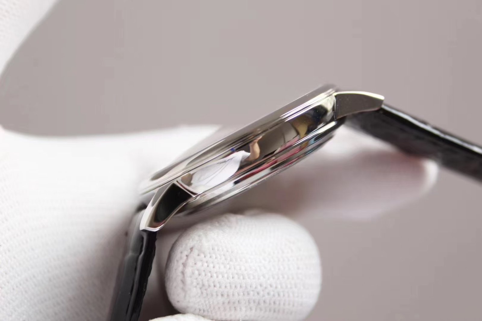 1. [Appearance] The 40 mm-diameter watch is presented in a rose gold case with polished sides and front, giving the watch a warm metallic luster. The slim case is visible from the side, with a thickness of 8.55 millimeters and elegantly rounded lines.
