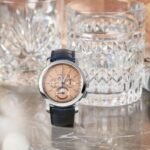 This 950 platinum watch is equipped with two high-quality complications: a column-wheel chronograph mechanism and a perpetual calendar that will not need to be adjusted until the year 2100. The calendar is enhanced by a moon phase display featuring a starry sky and two three-dimensional moons in 950 platinum. A central chronograph hand allows the wearer to read the average speed of an object’s movement through a lacquered tachymeter scale on the dial.