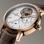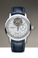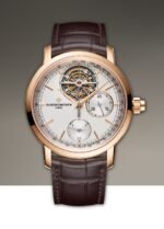 This 18K 5N pink gold timepiece combines two of Fine Watchmaking’s greatest complications – a superb single-pusher chronograph movement and an exquisite tourbillon. The tourbillon cage, inspired by the Maltese Cross, is positioned at 12 o’clock on the dial and is pushed by an intervals wheel that displays the seconds, thus enlarging the aperture of the tourbillon cage. The dial features a power-reserve indicator at 6 o’clock and a 45-minute chronograph subdial at 3 o’clock, which is complemented by a tachymeter scale on the edge of the dial and an orbital minute circle.