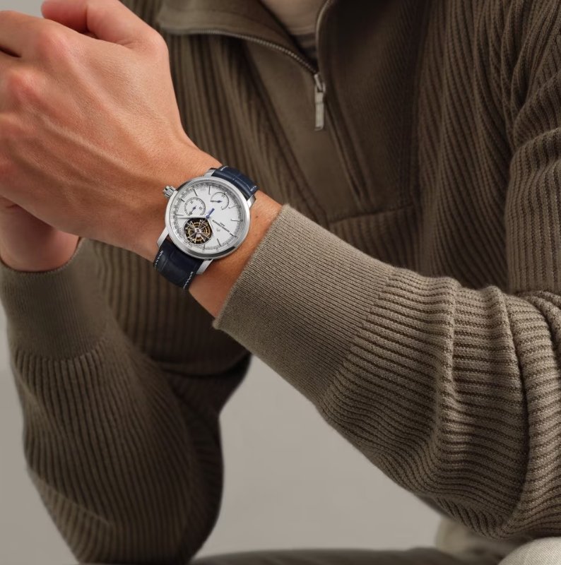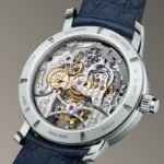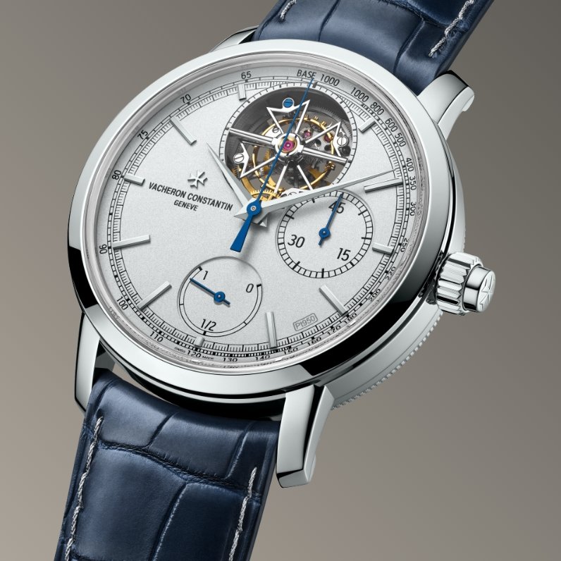 The Limited Edition Platinum Collection is a limited edition of 50 watches with case, dial, buckle and strap stitching in 950 platinum. This watch combines two of Fine Watchmaking’s greatest complications – a high-performance monopusher chronograph movement and an exquisite tourbillon. The tourbillon cage, inspired by the Maltese Cross, is positioned at 12 o’clock and is activated by an intermediate wheel indicating the seconds, thus enlarging the aperture of the tourbillon cage. The power-reserve indicator at 6 o’clock and the 45-minute counter at 3 o’clock are complemented by a tachymetric scale on the edge of the dial and an orbital minute circle.